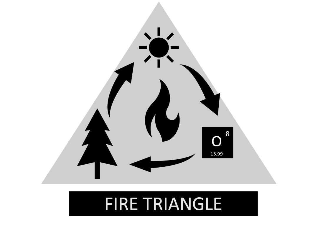 The fire triangle illustrates the interaction between the three components, which are required in right amount for a fire to ignite and sustain.